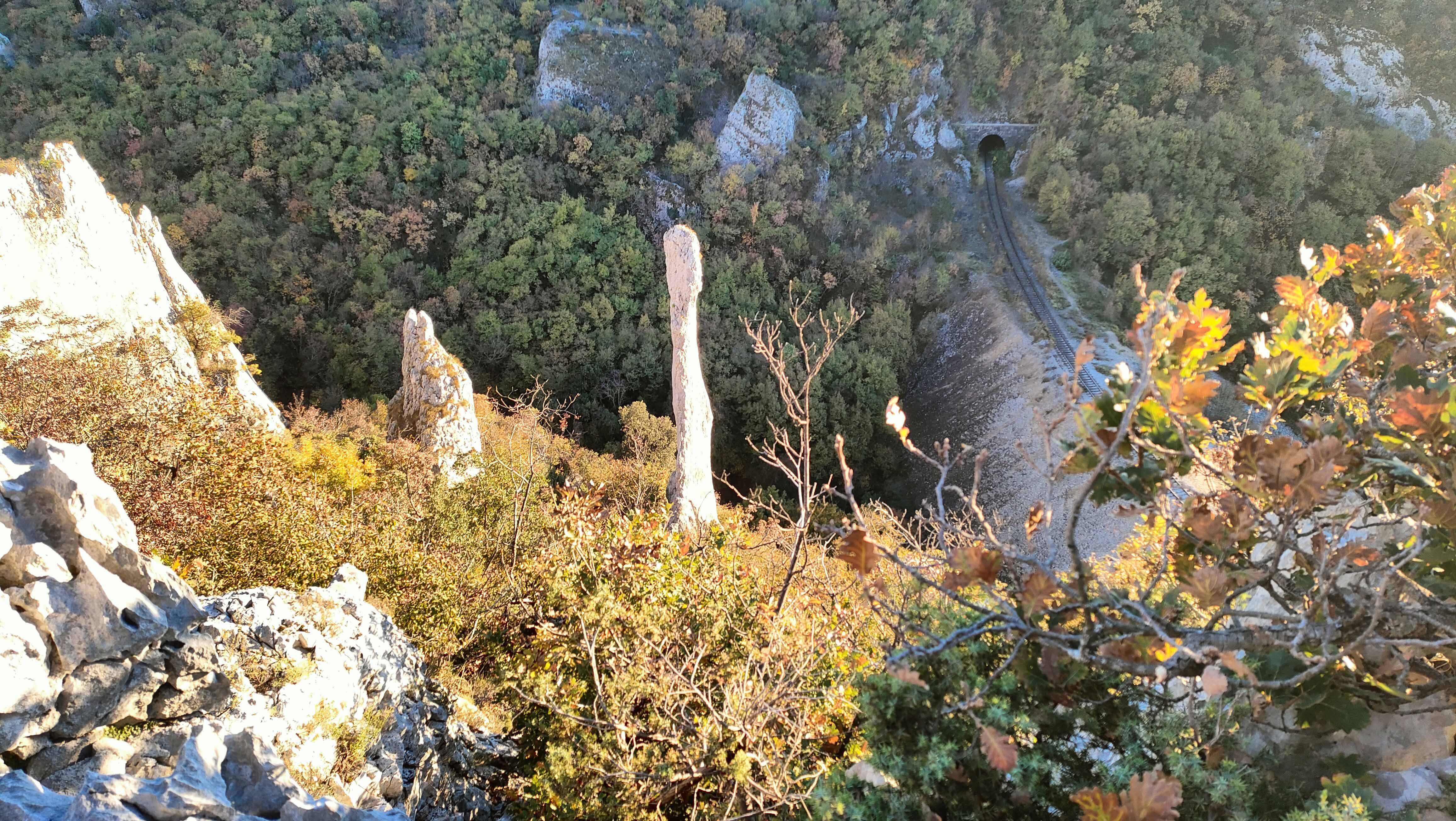 Na Svíci je lezení zakázáno. Pod ní je patrna nepoužívaná trať pro dopravu kamene z lomu.