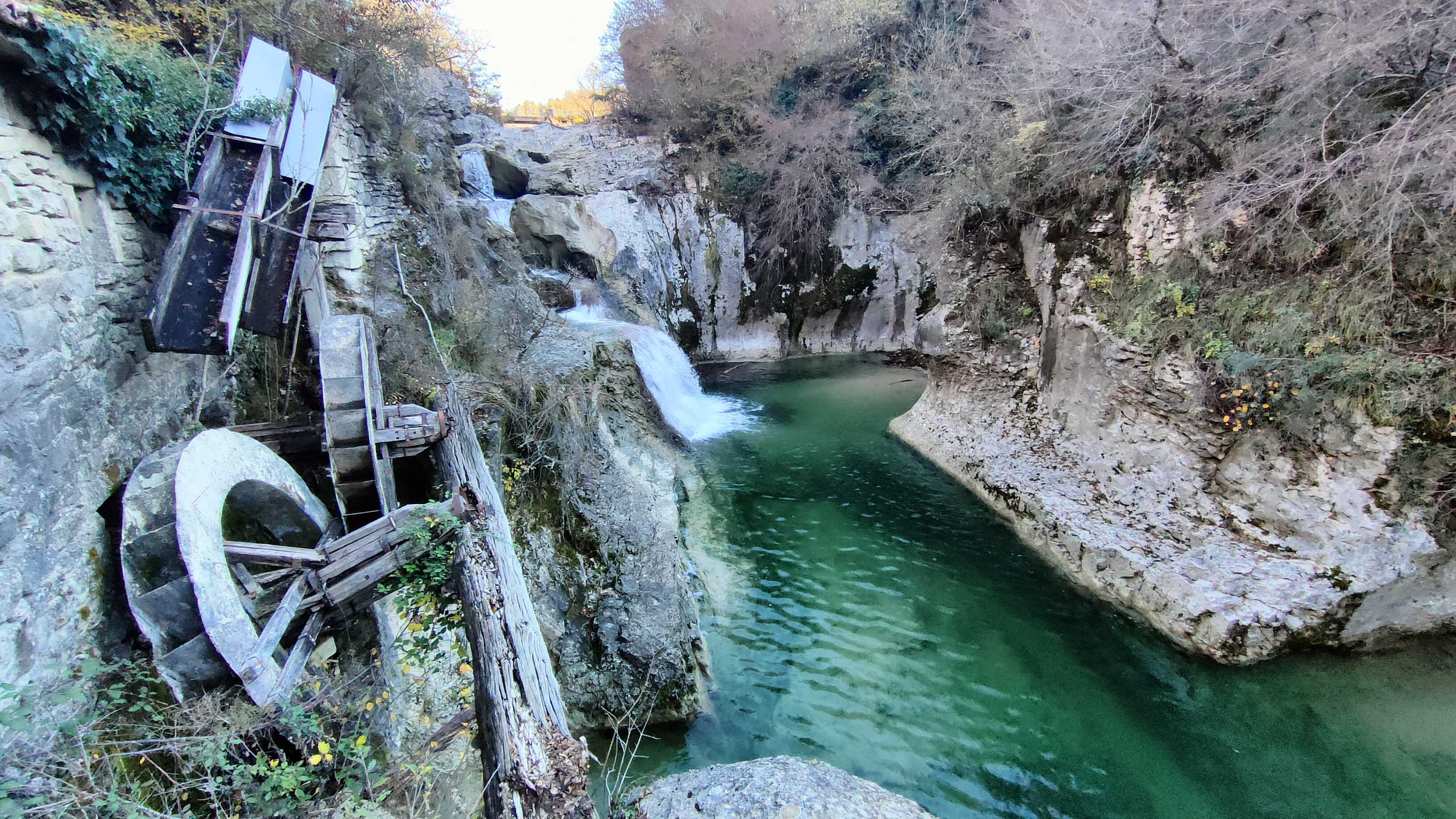 Místo bývalého mlýna v Kotlích. Blesk s Liborem (posilněni degustací pálenek před chvílí) odhodlaně skákají do laguny. Foto s důkazným materiálem je však z parametrických důvodů po vynoření nepublikovatelné. Asi to bylo studený !