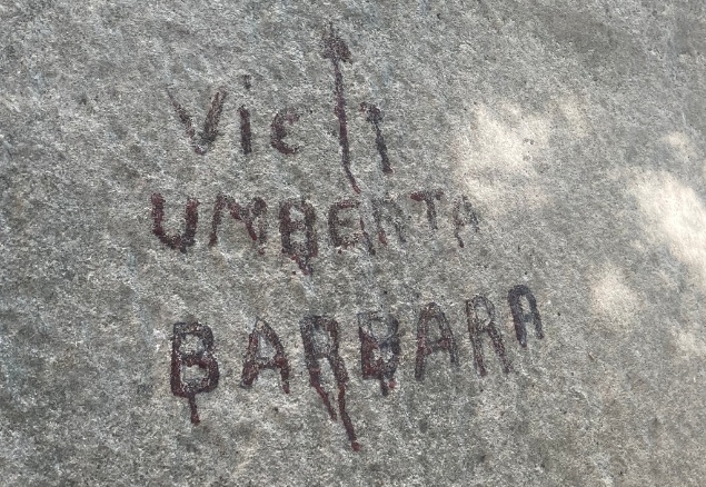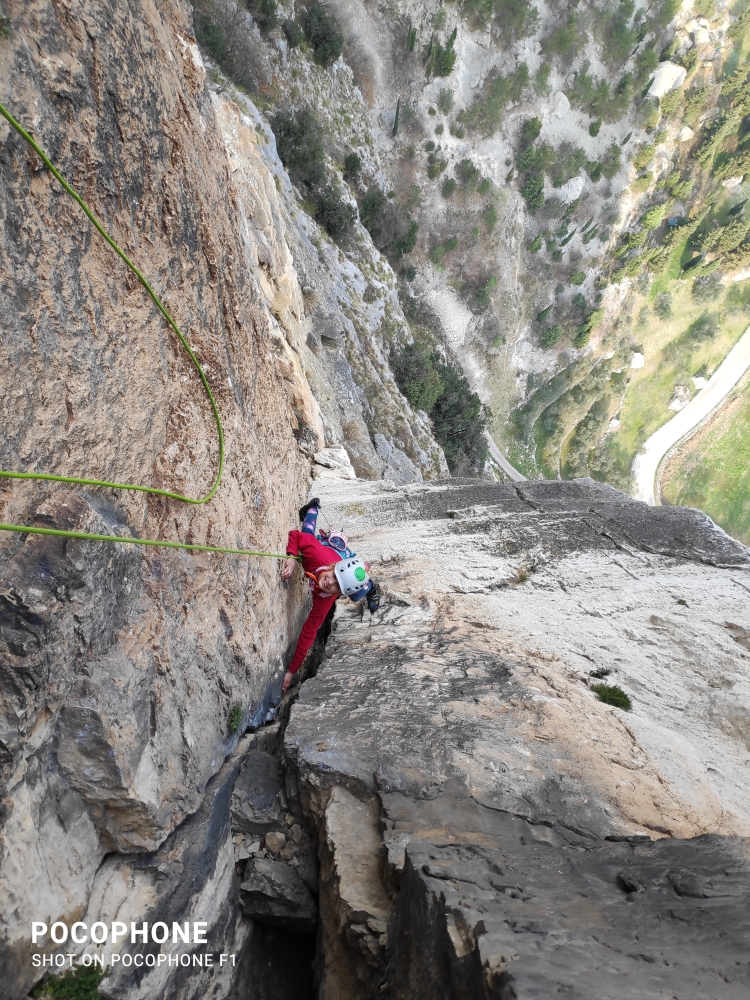 Druhý den se kolmo přemisťujeme pod masiv Colodri. Magnusek si příjezd pod skálu opakuje, protože zapomněl v ubytku lezečky. My mezitím hledáme nástup. Nápis na skále je jasný a můžeme začít.