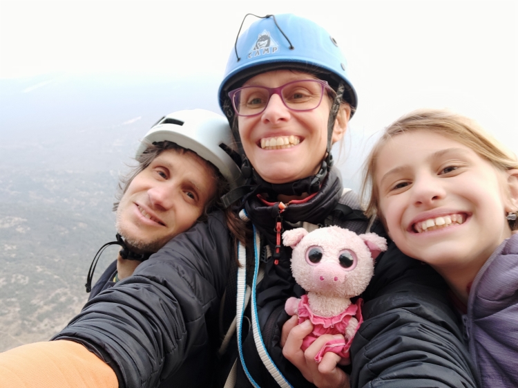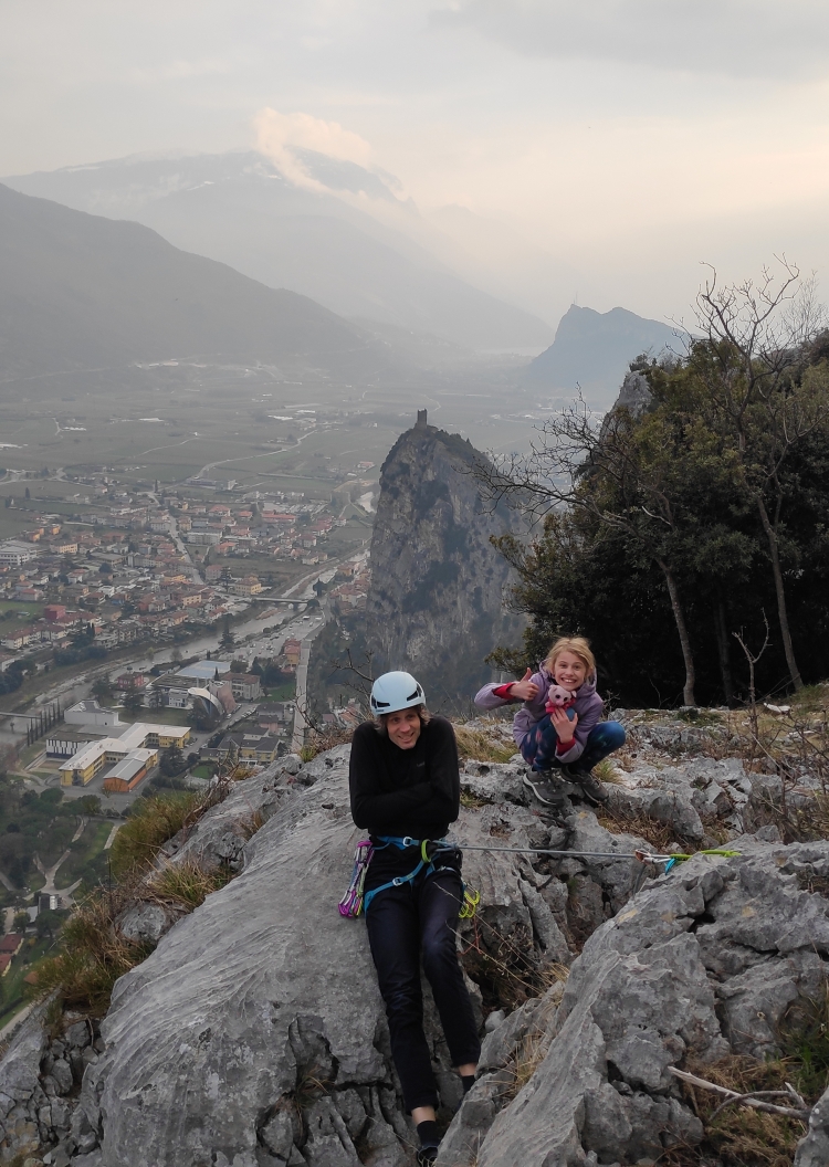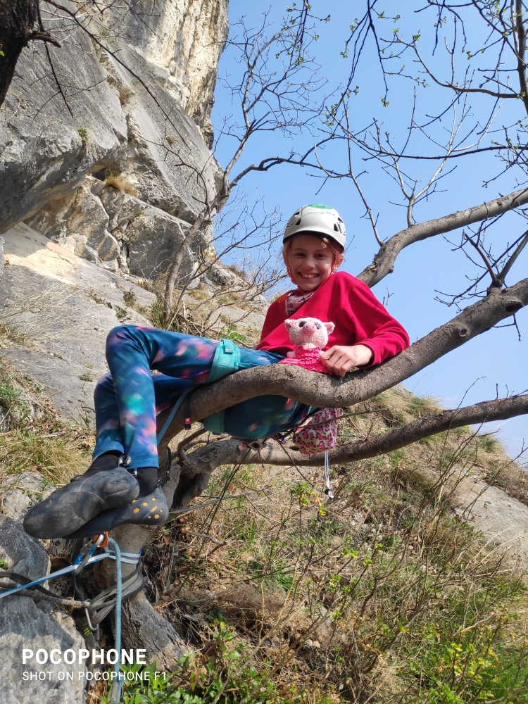 Nejdříve odmítám, protože si ještě pamatuji, jak jsem na stejném útvaru vlála za Magnuskem v cestě Zanzara a snažila se na oklouzané skále vytěžit maximum z každé expresky. Pokouším se použít argument, že nejsme na vícedélku vybaveni, ale tento neobstojí - 80 m lana, převaha expresek, 4 šité smyčky a kevlarka přeci musí na nějaký trapný 6a stačit! Bohužel mě nenapadá žádný dostatečně velkolepý náhradní plán, tak nakonec souhlasím, že to zkusíme. Teď ještě přesvědčit Ditku. Shodou okolností je s námi na zájezdu i oblíbená "plyšanda" od St. Václava Prasinka (italsky Porcellina). Vysvětluju Ditce, že Prasinka pochází z Colodri, a že by se moc ráda podívala do míst, kde dříve byla doma. Ditka skáče na vějičku a nadšeně souhlasí.
