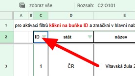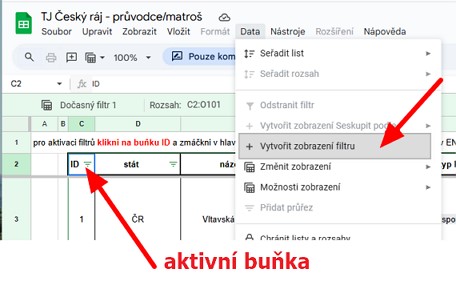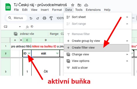 - a příkazem "Vytvořit zobrazení filtru". To se provádí v menu "Data" Google Sheet, viz. obrázky níže.